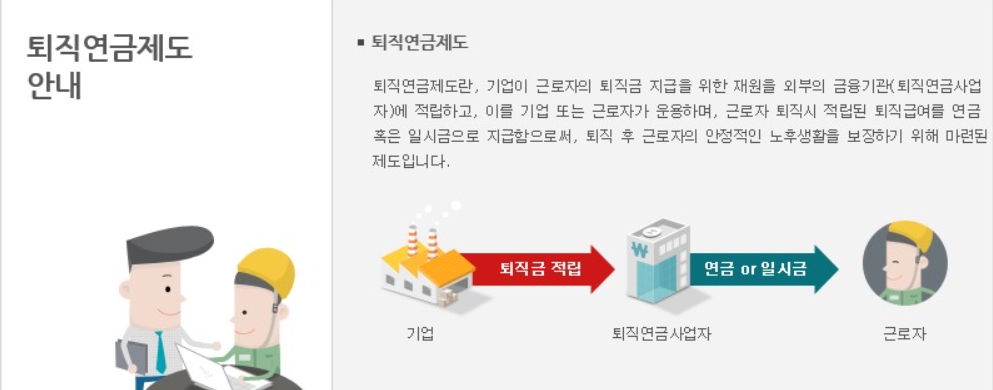 퇴직연금제도는 급여 근로자가 재직기간 중 사용자가 퇴직급여 재원을 금융회사에 적립하고, 이 재원을 사용자 또는 근로자가 자유롭게 운용하여 퇴직 시 연금 또는 일시금으로 지급하는 제도이다.